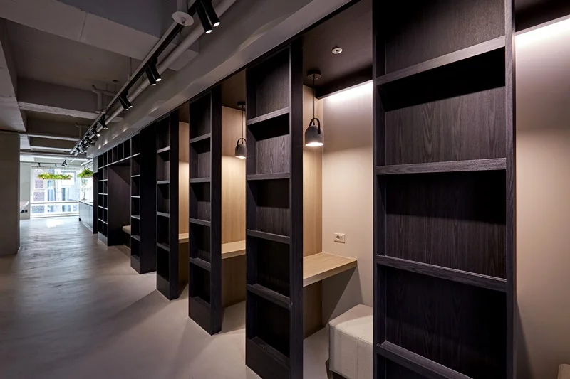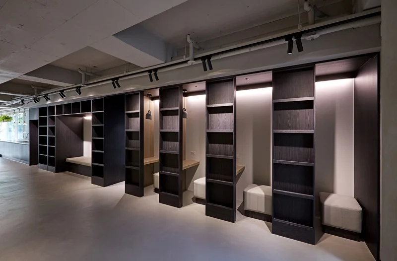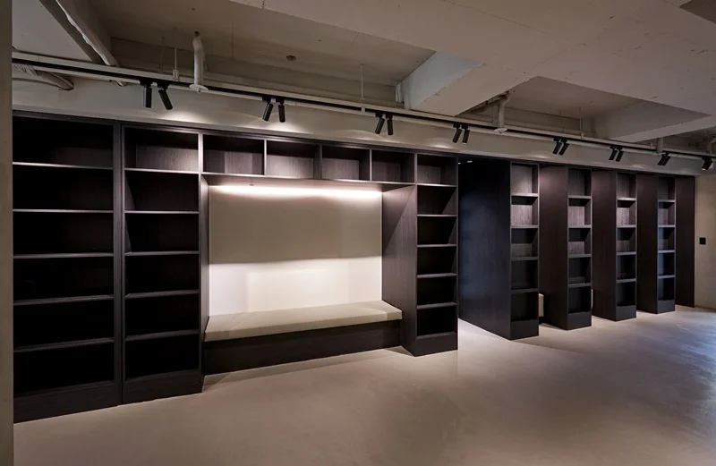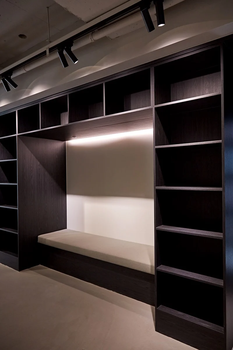 벽면을 따라 길게 이어진 맞춤형 수납 시스템은 이번 시공의 백미 중 하나입니다. 다크 우드 결이 살아있는 오픈 선반과 매립형 벤치 공간을 조합하여 수납력과 휴게 기능을 동시에 확보했는데요. 특히 벤치 상단에 매립된 부드러운 전구색 조명은 딱딱할 수 있는 사무실 분위기를 한층 부드럽게 완화해 줍니다. 수납장의 칸칸마다 설치된 조명은 진열되는 물건조차 하나의 오브제처럼 보이게 만드는 마법을 부리죠. 이 수납장 라인은 공간 전체의 동선을 가이드하는 역할까지 겸하며 복도 끝까지 이어져 통일감을 부여합니다.
