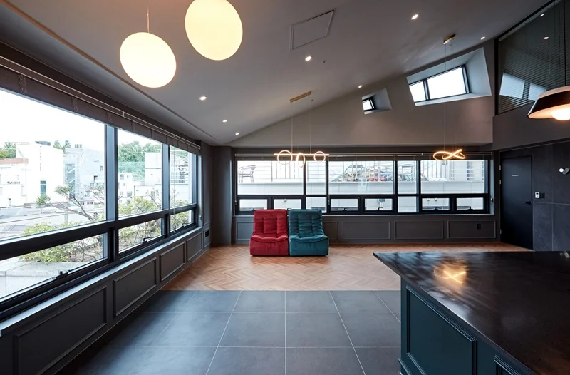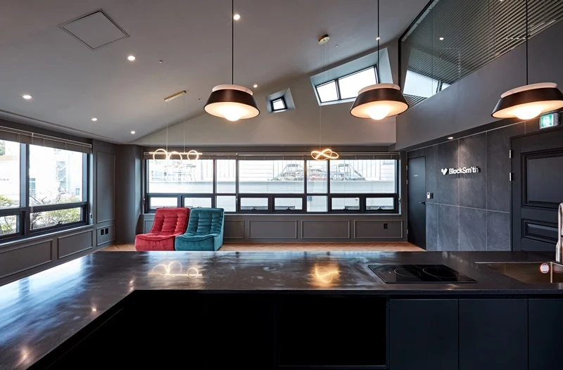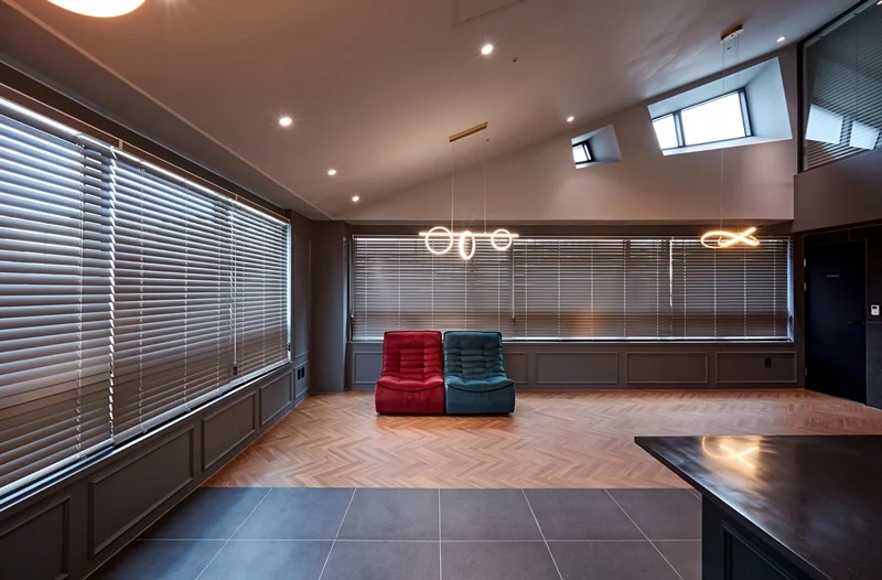 강남의 시티뷰가 한눈에 들어오는 전면 통창에는 세련된 알루미늄 블라인드를 설치해 채광을 정교하게 조절할 수 있도록 했고, 자칫 차가워 보일 수 있는 무채색 공간에 레드와 블루 컬러가 믹스된 감각적인 소파를 배치함으로써 생동감 넘치는 비즈니스 라운지 환경을 조성했습니다. 전체적으로 이번 시공은 단순한 사무 보조 공간을 넘어 구성원들이 자부심을 느끼며 진정한 휴식을 취할 수 있는 고품격 오피스 라이프스타일을 완벽하게 구현해냈습니다.