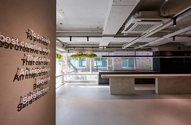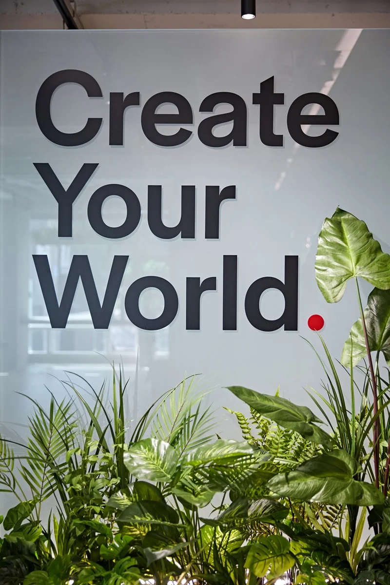 라운지의 한복판에는 ‘Create Your World.’라는 슬로건이 새겨진 유리 아트월과 대형 플랜터가 자리 잡고 있습니다. 투명한 유리 너머로 비치는 초록빛 식물들은 무채색 공간에 생명력을 불어넣는 ‘플랜테리어’의 정석을 보여주는데요. 식물 아래 설치된 조명은 밤이 되면 나뭇잎의 실루엣을 벽면에 투사하여 몽환적인 분위기를 연출합니다. 공기 정화 기능은 물론 구성원들의 스트레스를 낮춰주는 이 공간은 기능과 미학을 동시에 충족시키는 핵심 포인트가 된답니다.