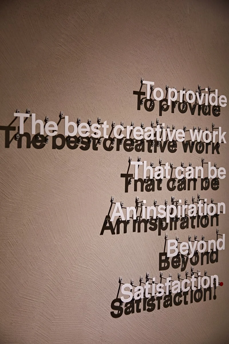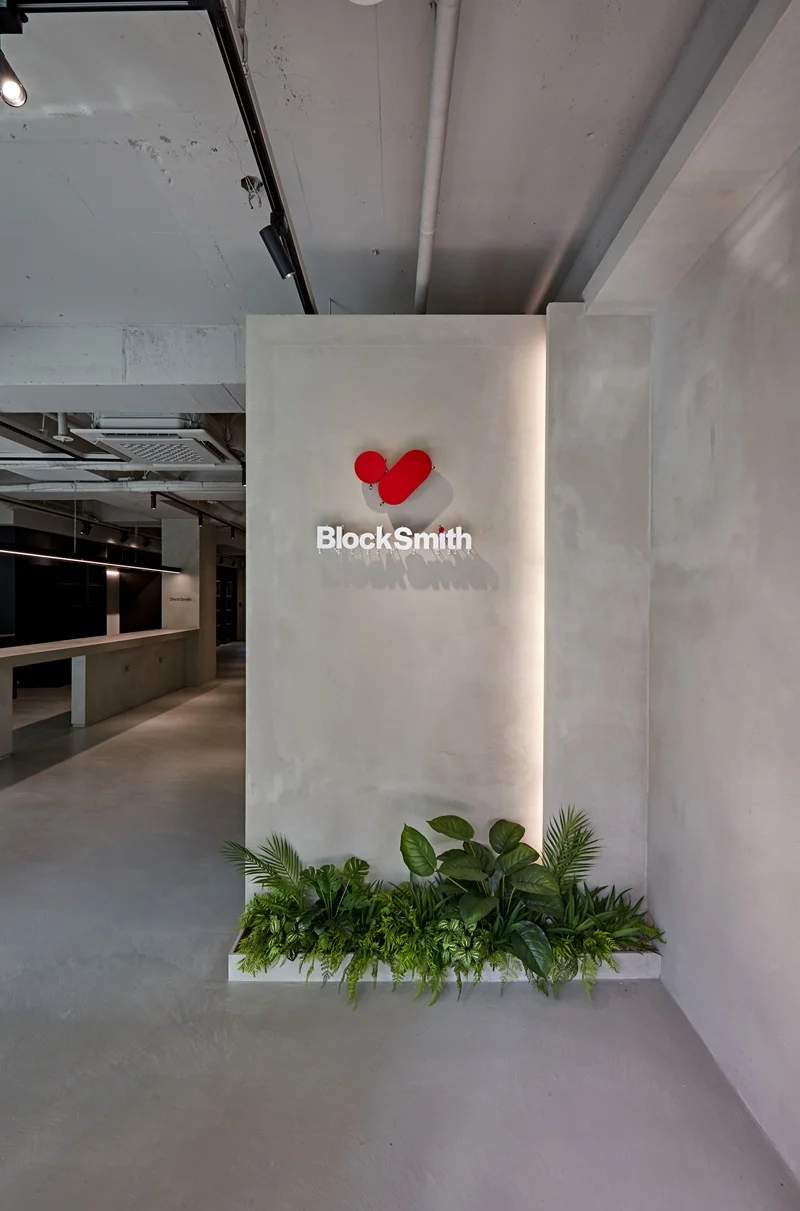 이제 본격적으로 시공이 완료된 현장의 구석구석을 아주 상세히 살펴보겠습니다. 이번 강남인테리어 오피스 시공의 얼굴이라 할 수 있는 입구부 로고 월부터 예사롭지 않은 분위기를 자아내는데요. 거친 듯 매끄러운 노출 콘크리트 스타일의 아트월 위에 강렬한 레드 포인트가 들어간 로고를 배치하여 기업의 첫인상을 확고히 각인시켰습니다. 벽면 하단에서 상단으로 흐르는 은은한 간접 조명은 벽면의 텍스처를 더욱 입체적으로 살려주며 고급스러운 무드를 형성합니다. 바로 옆 벽면에는 입체 폰트를 활용한 레터링 월을 설계했는데, 그림자가 지는 각도까지 계산하여 공간에 깊이감과 브랜드 철학을 동시에 담아냈습니다.