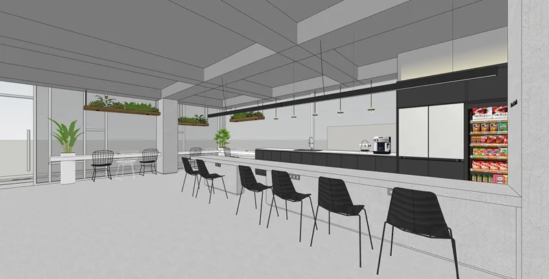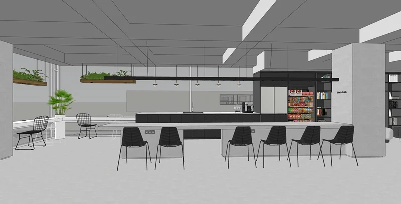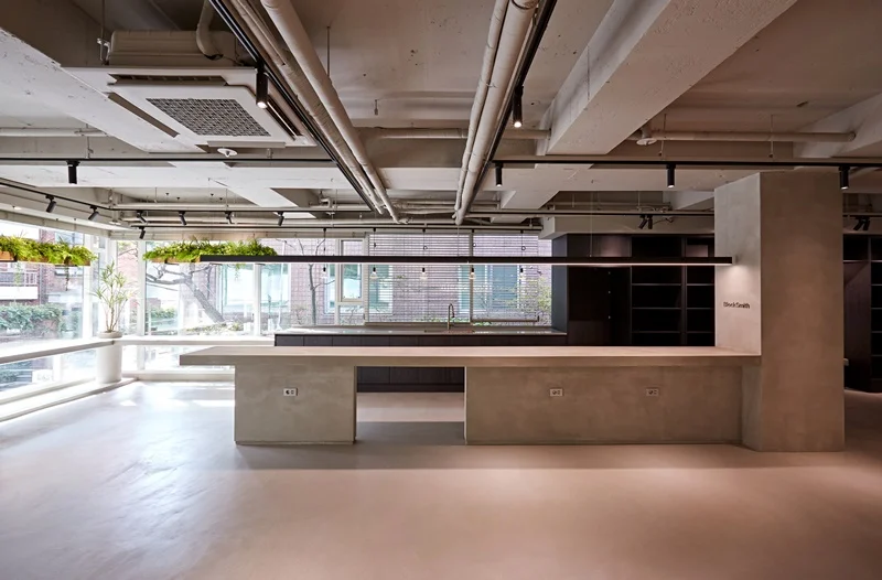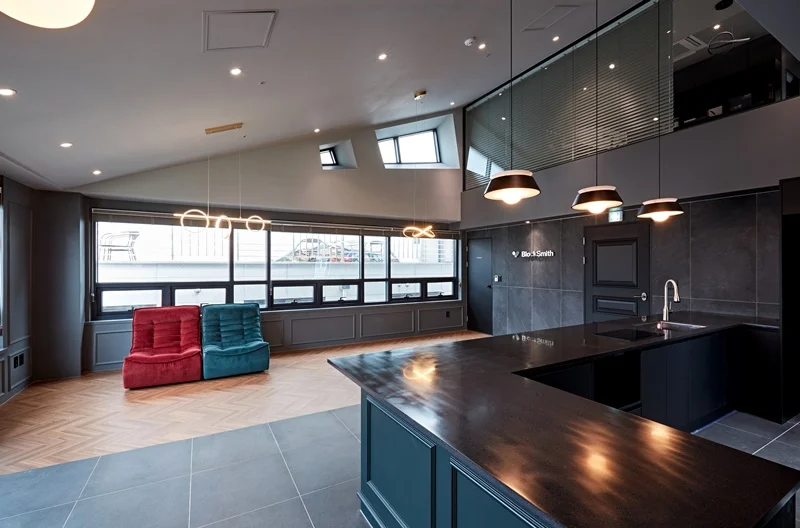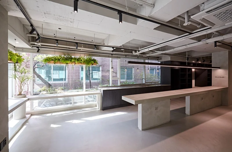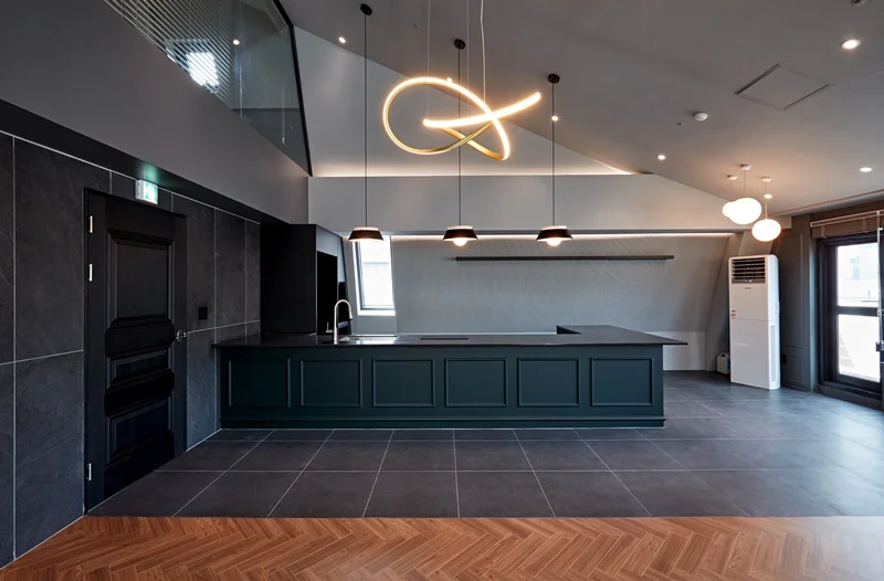 라운지의 중심을 잡고 있는 거대한 콘크리트 질감 아일랜드 테이블은 이번 강남인테리어의 기술력이 응집된 결과물입니다. 이 테이블은 카페처럼 자유로운 업무는 물론, 하단에 설치된 콘센트와 넓은 상판 덕분에 대규모 미팅 테이블로도 손색이 없습니다. 아일랜드 뒤편으로 보이는 탕비 공간은 짙은 차콜 그레이 톤의 하부장과 매끄러운 상판으로 마감하여 청결하면서도 무게감 있는 분위기를 조성했습니다.