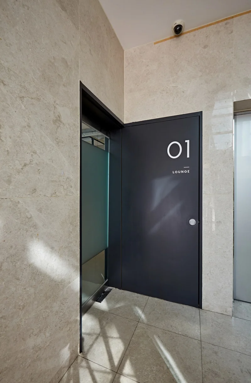 입구부터 묵직한 다크 그레이 톤의 도어와 대비되는 화이트 폰트의 ’01 LOUNGE’ 사인물이 공간의 정체성을 명확히 전달하며, 복도 벽면을 채운 아이보리 대리석 타일은 진입로에서부터 격조 높은 분위기를 자아냅니다. 내부로 들어서면 일반적인 평천장이 아닌 사선형 구조를 그대로 살린 노출 천장이 압도적인 개방감을 선사하며, 천장의 굴곡을 따라 흐르는 라인 간접 조명이 공간의 입체감을 더욱 극대화합니다.