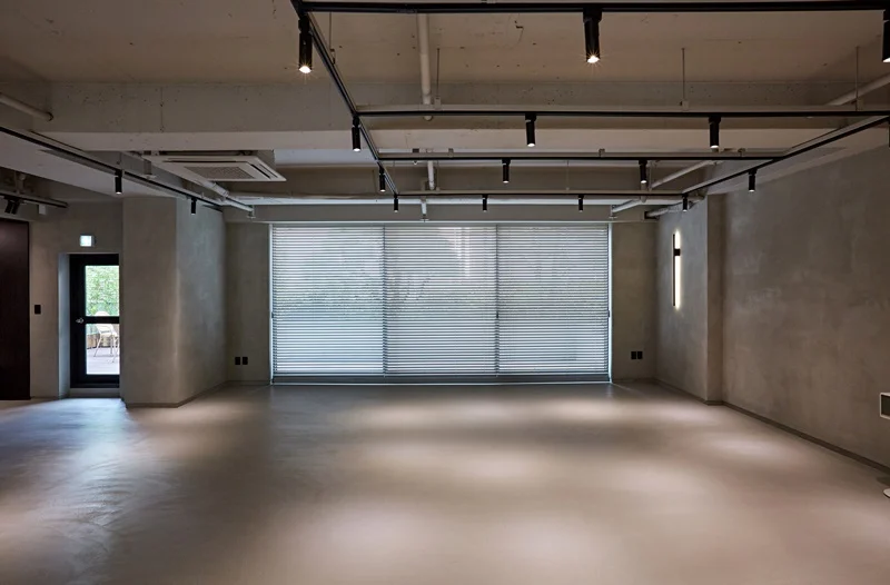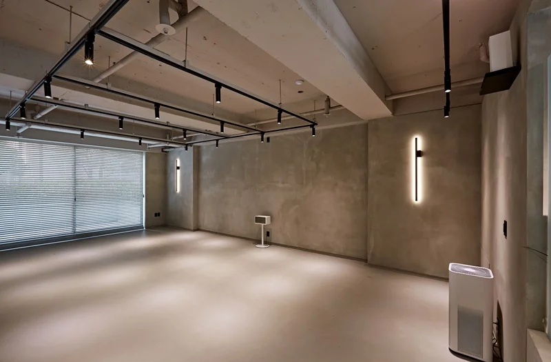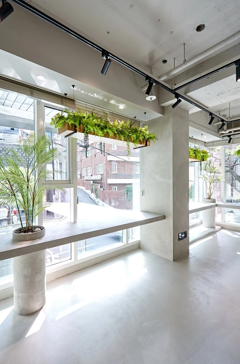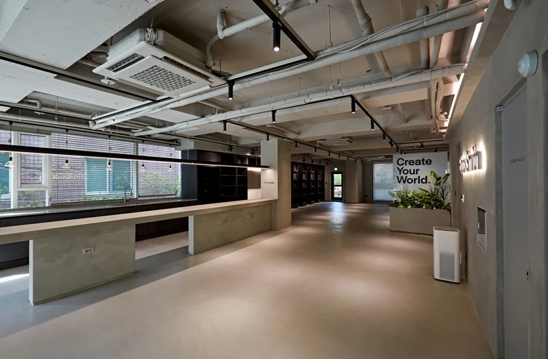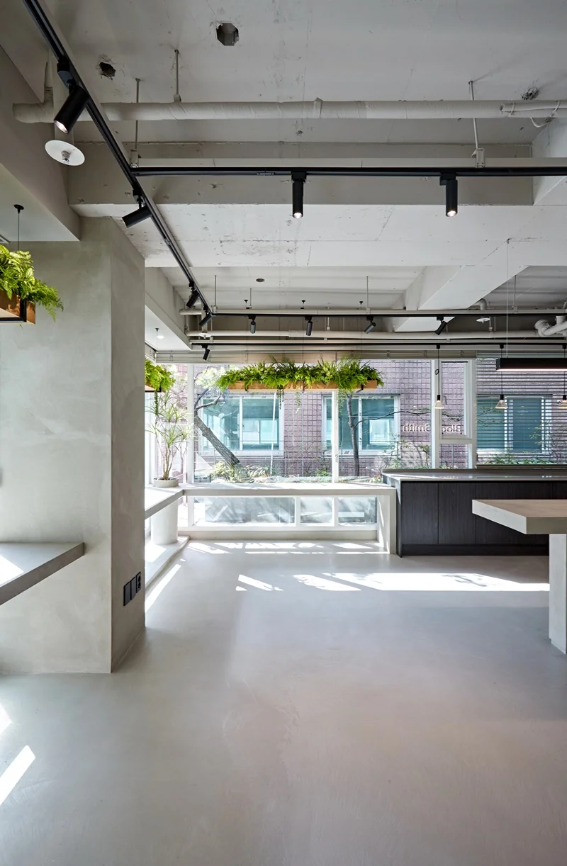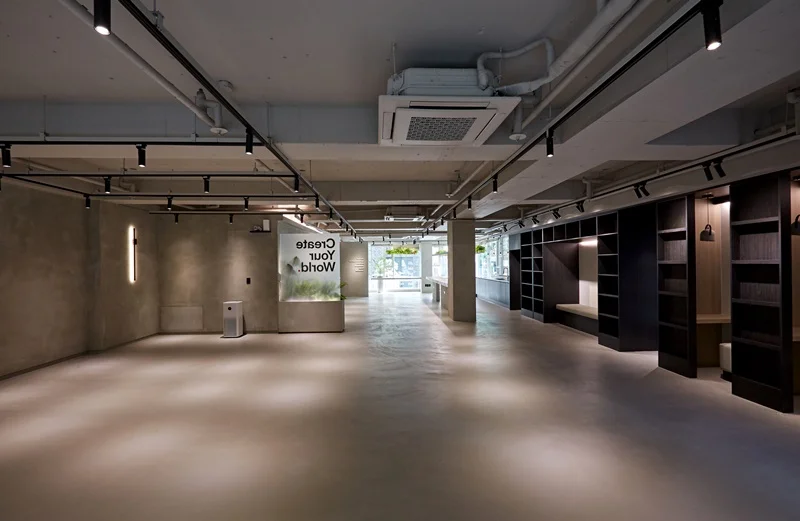 내부로 들어서면 시원하게 뻗은 개방형 라운지가 시선을 압도합니다. 화이트로 도장된 노출 천장은 배관과 덕트를 그대로 드러내면서도 깔끔하게 정돈되어 인더스트리얼하면서도 모던한 느낌을 주는데요. 천장을 가로지르는 블랙 라인 조명과 스포트라이트 조명은 공간에 리듬감을 부여하며 필요한 곳에 정확한 빛을 전달합니다.