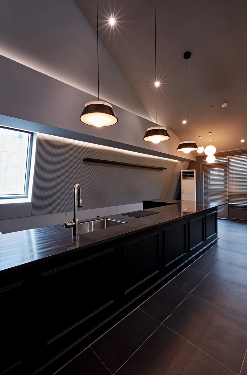 특히 이번 시공의 묘미는 벽면의 질감과 조명의 조화에서 극명하게 드러나는데, 주방 조리대 뒷면을 장식한 미세한 세로 리브 패턴의 템바보드 벽면은 간접 조명을 받았을 때 은은한 음영을 만들어내며 공간에 깊이감을 더해줍니다. 주방 상판은 내구성이 뛰어난 다크 톤의 인조대리석이나 세라믹 소재를 채택하여 실질적인 유지관리의 편의성을 높였고, 매립형 인덕션과 세련된 거위목 수전은 미니멀한 주방 라인을 해치지 않으면서도 실용적인 기능을 완벽히 수행합니다.