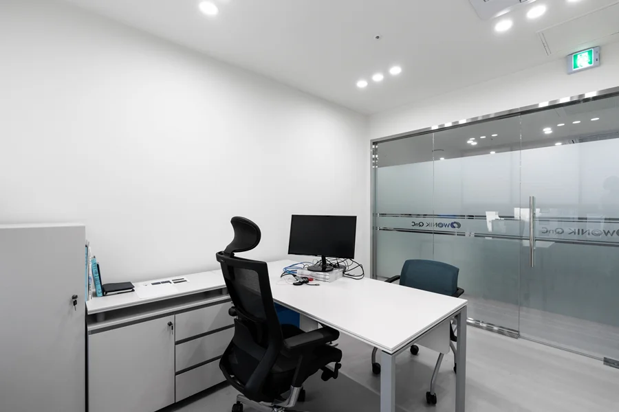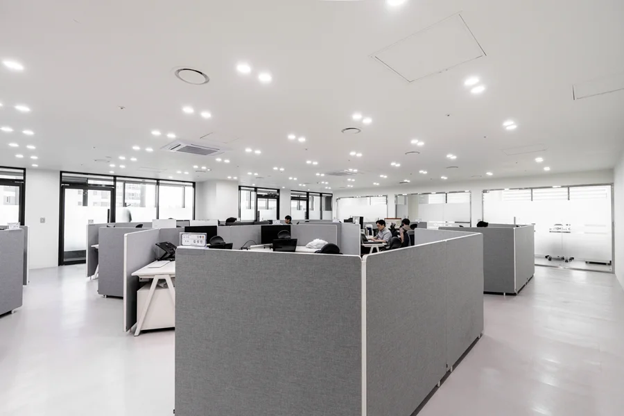 이런 유형의 사무실은 유리 파티션, 열린 워크스테이션, 공동 작업 공간 등을 특징으로 합니다. 시각적으로 열려있는 구조는 소통과 협력을 촉진하며, 직원들이 서로를 쉽게 모니터링하고 지원할 수 있게 해줍니다.