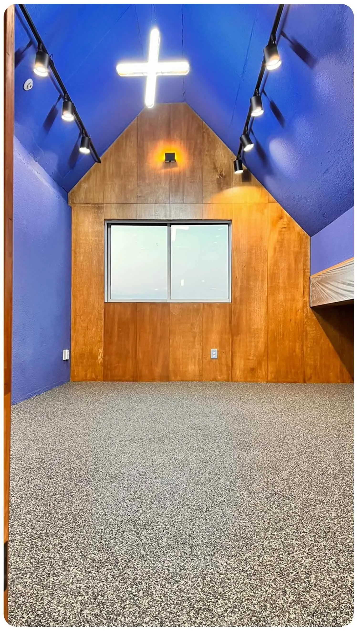 업무 공간은 따로 파티션을 두거나 문 설치를 하지 않고 오픈 상태로 두어 답답함을 느낄 수 있는 요소를 제거해 주었는데요. 천장이 삼각형 형태라 층고가 높고 러스틱한 분위기에 맞게 레일 조명을 활용했습니다.
