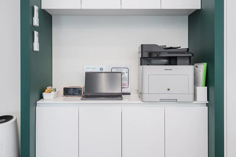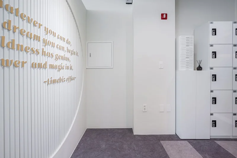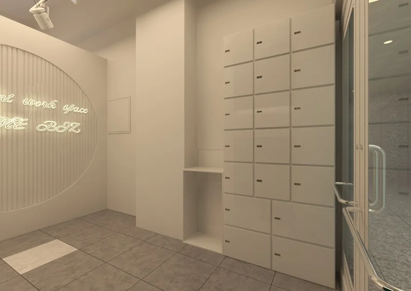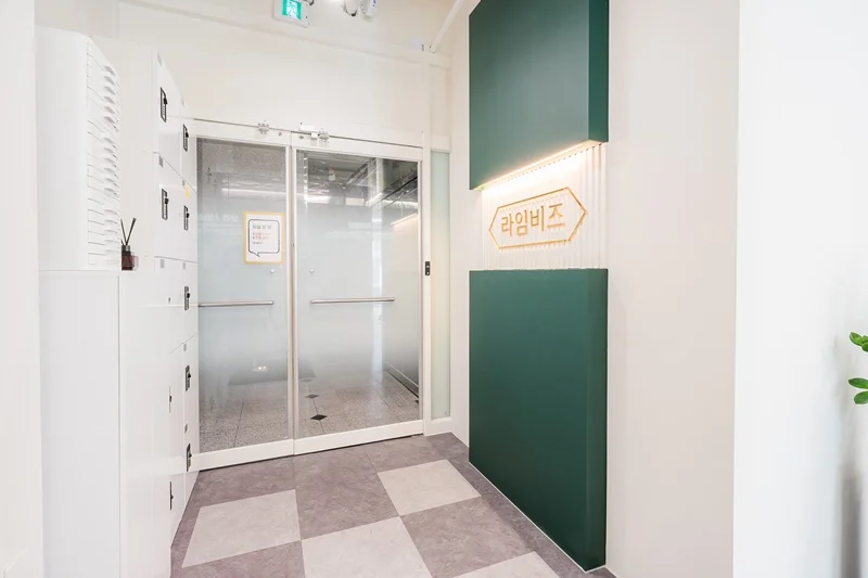 문을 열고 내부로 들어서면 마주하는 현관 진입 공간에는 입주사들의 편의를 위한 화이트 컬러의 로커 시스템이 질서정연하게 배치되어 있는데요. 하이그로시 마감으로 청결함을 강조한 로커는 전자식 도어락을 부착하여 개인 소지품을 안전하게 보관할 수 있게 했으며, 그 옆으로는 넉넉한 수량의 서류 보관용 서랍장을 추가로 배치하여 공간 활용도를 극대화했답니다. 바닥은 오염에 강한 퍼플과 그레이 톤이 섞인 사각 데코타일을 교차 배치하여 시각적인 리듬감을 주었는데요. 로커 위에는 디퓨저나 소품을 놓을 수 있는 여유 공간을 두어 비즈니스 공간 특유의 딱딱함을 부드럽게 완화했답니다.