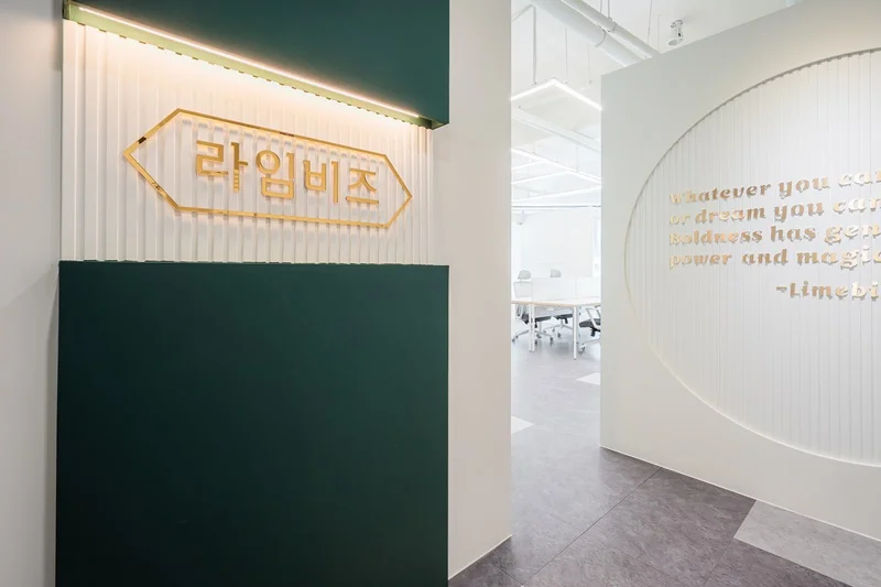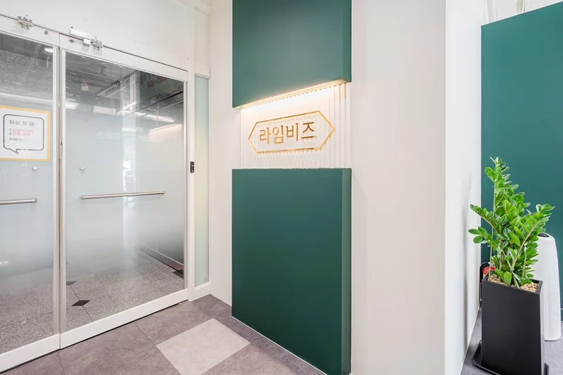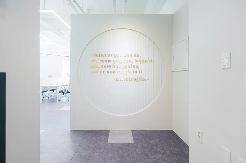 공유오피스의 첫인상을 결정짓는 외부 입구 파사드부터 살펴보면, 깔끔한 화이트 프레임의 강화유리 도어 상단에 골드 톤의 입체 채널 사인을 배치하여 화사하면서도 고급스러운 전문성을 강조했는데요. 상주 및 비상주 서비스를 안내하는 깔끔한 시트 작업을 병행하여 정보 전달력을 높였으며, 도어 옆에는 최신식 출입 통제 시스템을 설치하여 보안을 강화했답니다. 천장의 매립 조명이 입구 바닥면을 은은하게 비추어 방문객에게 환대받는 느낌을 전달하는데요. 복도에서 바라본 내부는 안개가 낀 듯한 그라데이션 시트 처리를 통해 내부의 프라이버시를 지키면서도 밝은 에너지가 밖으로 배어 나오도록 연출했답니다.