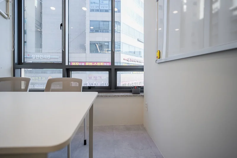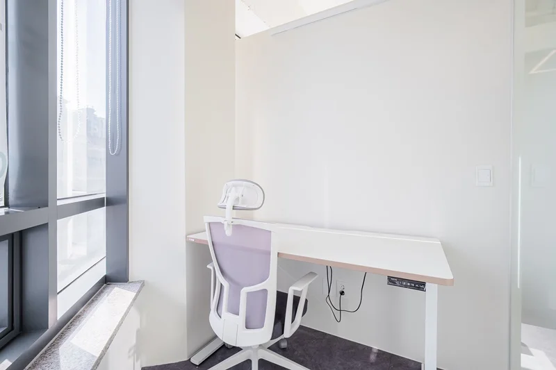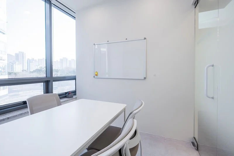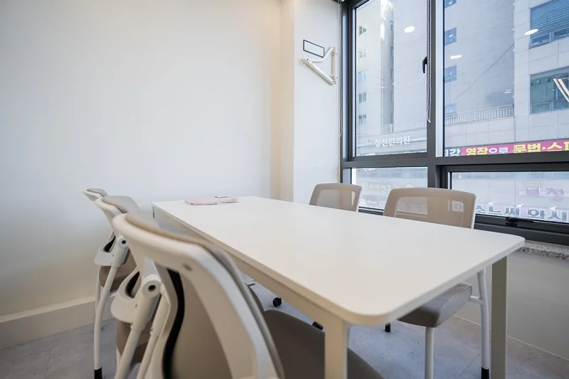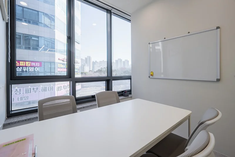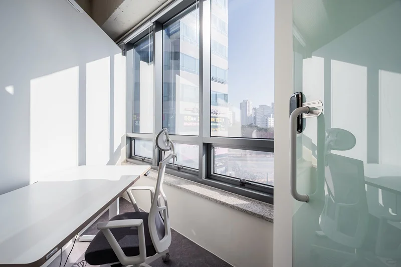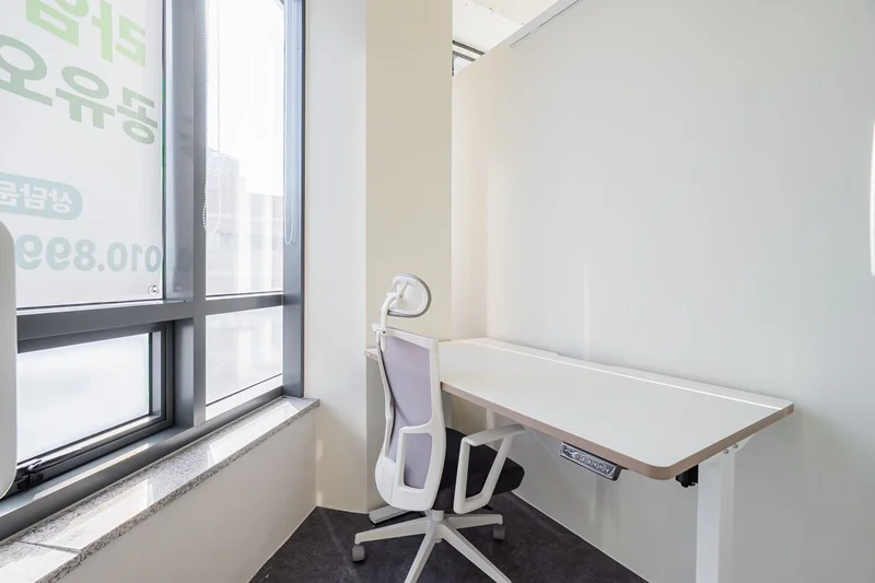 또한 창가 쪽에 배치된 프리미엄 호실은 외부 풍경이 한눈에 들어오는 대형 통창을 통해 자연 채광이 풍부하게 유입되도록 설계했는데요. 화이트 블라인드를 설치하여 빛의 양을 자유롭게 조절할 수 있게 했으며, 창밖으로 보이는 도심 뷰는 업무 중 리프레시를 도와주는 훌륭한 요소가 된답니다. 창가 좌석 역시 모션 데스크와 편안한 메쉬 소재의 의자를 배치하여 장시간 햇빛 아래에서도 쾌적하게 업무를 수행할 수 있도록 디테일을 챙겼답니다.