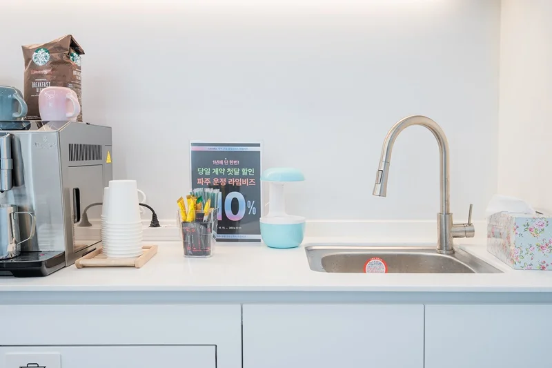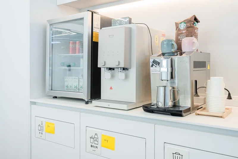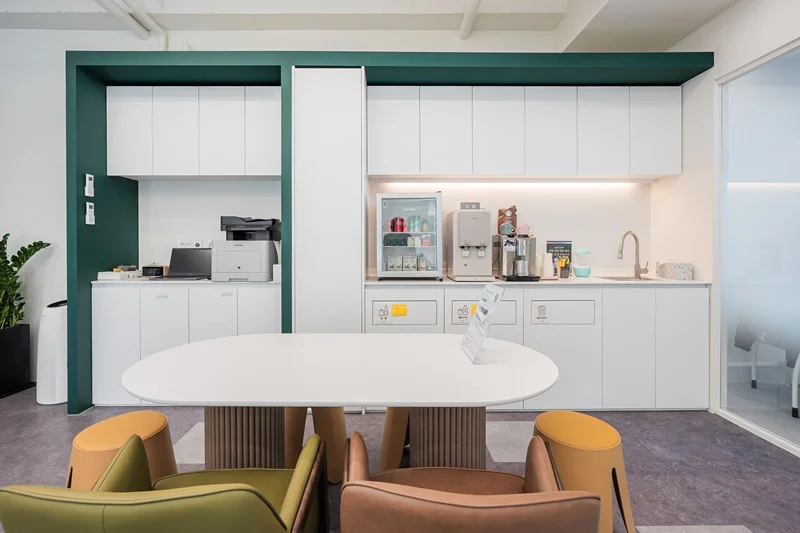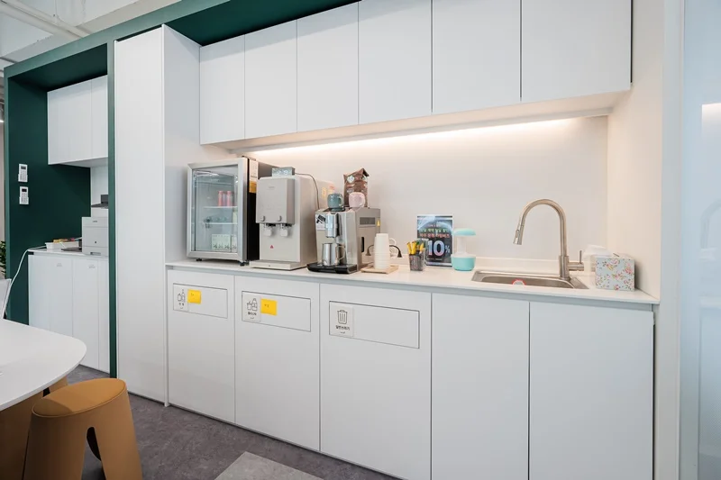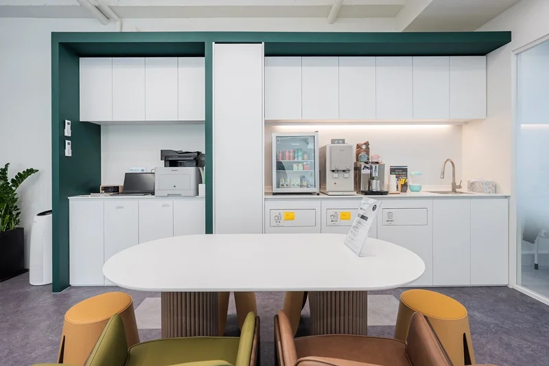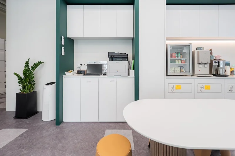 공간 한편에 마련된 카페테리아 및 캔틴 공간은 딥 그린 컬러를 포인트로 사용하여 차분하면서도 감각적인 무드를 조성했는데요. 벽면 전체를 활용한 맞춤형 싱크대와 수납장은 상부장 하단에 전구색 간접 조명을 설치하여 아늑한 분위기를 연출했답니다. 이곳에는 미니 냉장고, 정수기, 커피 머신 등 입주민을 위한 편의 시설이 깔끔하게 매립될 수 있도록 가전의 규격에 맞춰 제작되었으며, 하단에는 분리수거함까지 일체형으로 디자인하여 청결한 관리가 가능하게 했는데요.