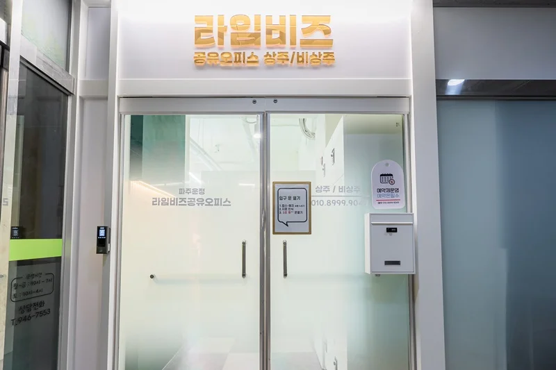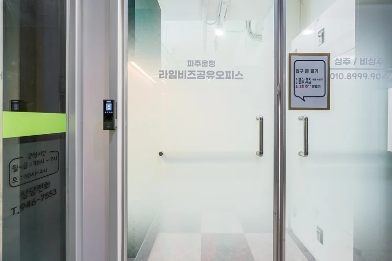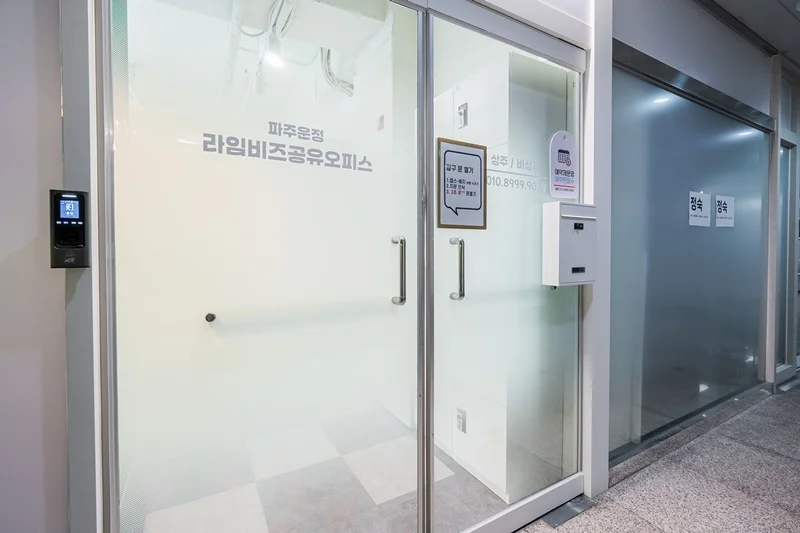 공유오피스의 핵심인 개별 사무 공간으로 들어가 보면, 복도를 따라 배치된 각 호실은 투명한 유리 벽체에 불투명 그라데이션 시트를 부착하여 개방감과 프라이버시라는 두 마리 토끼를 모두 잡았는데요. 각 호실 입구마다 블랙 컬러의 디지털 도어락과 호실 번호 사인을 부착하여 독립된 오피스임을 명확히 했답니다.