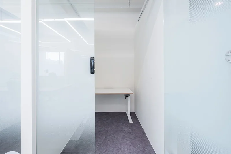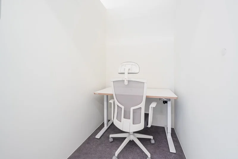 벽면에 바짝 붙여 배치된 콤팩트한 1인실은 집중력을 높여야 하는 작업에 최적화되어 있는데요. 불필요한 장식을 배제하고 모노톤으로 마감하여 몰입감을 높였으며, 천장에서 내려오는 고른 조명 덕분에 아늑한 서재 같은 분위기를 풍긴답니다.