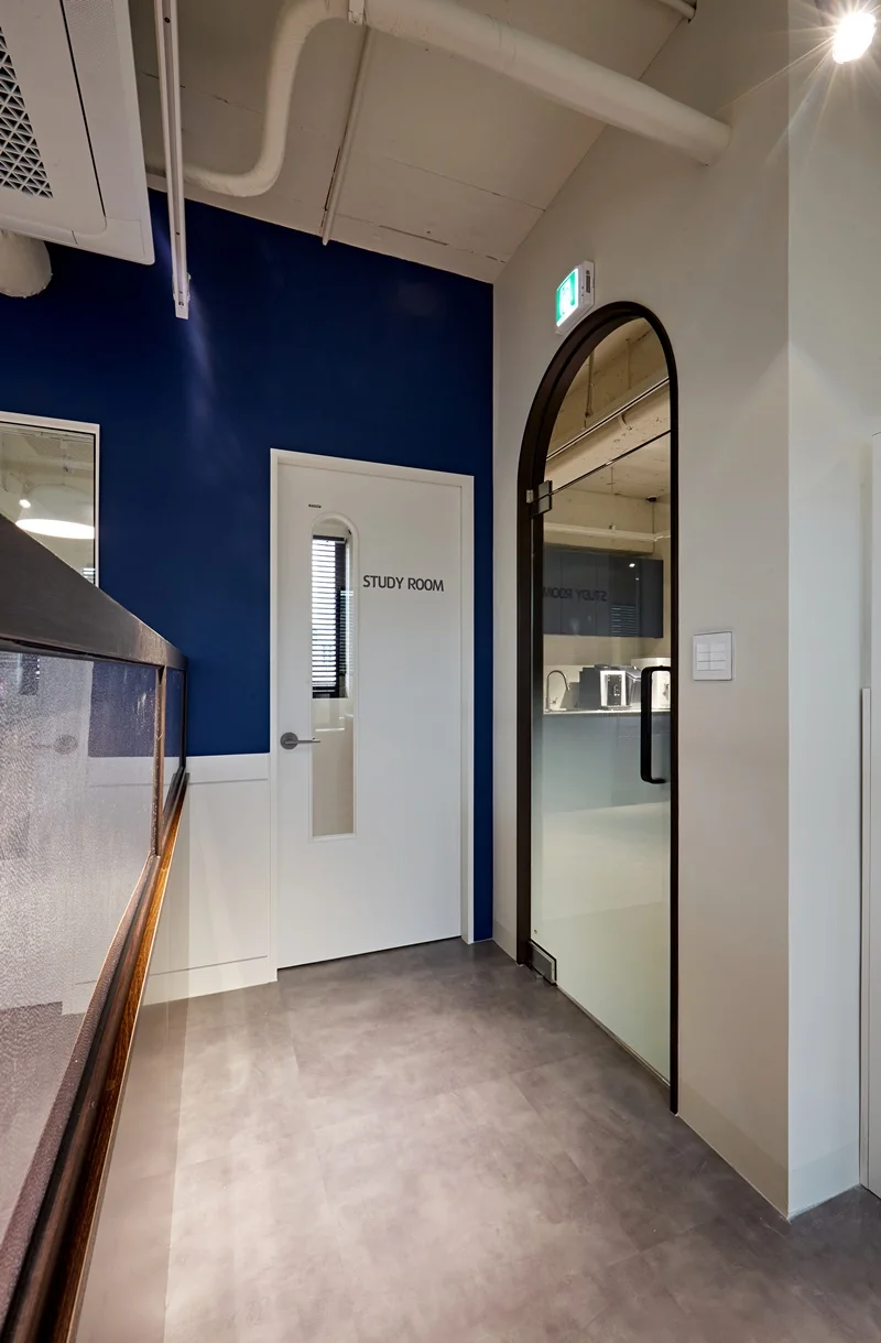 벽면에는 화이트톤과 아래부분에 블루 색상을 사용하여 시원한 톤의 원목 장식과 아기자기한 소품을 배치하여 딱딱한 학습 환경이 아니라 집에서 책상에 앉아 공부하는 듯한 친근한 느낌을 주었습니다.