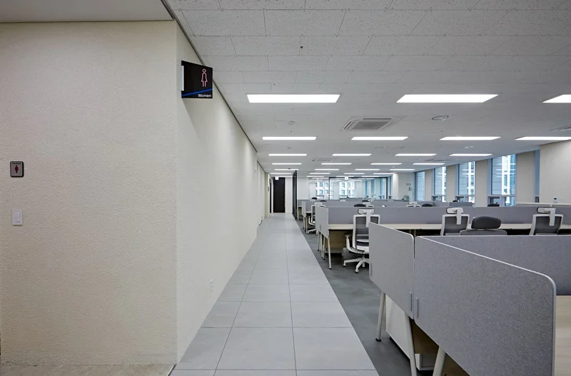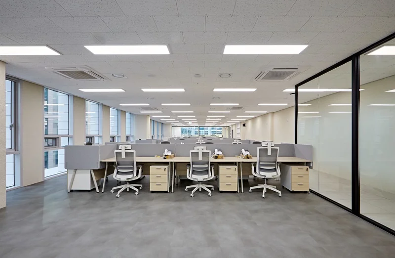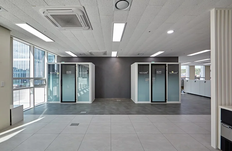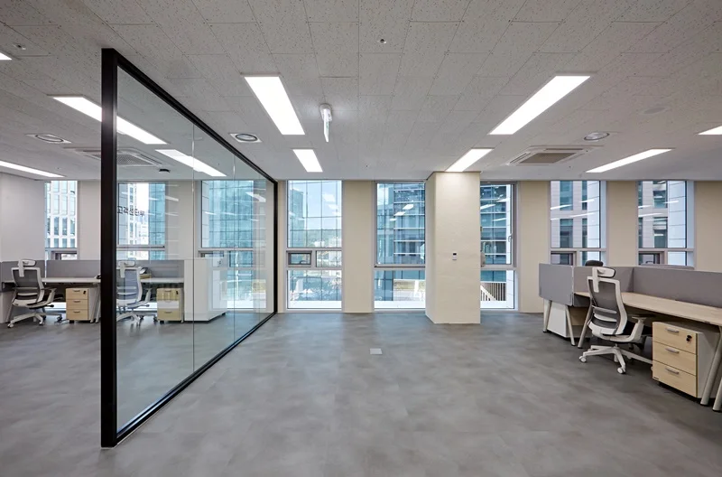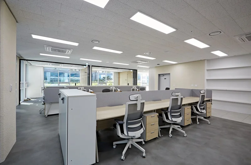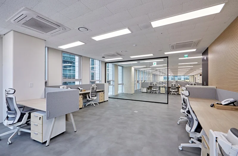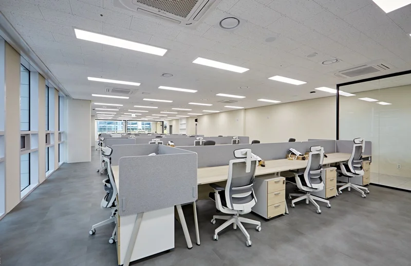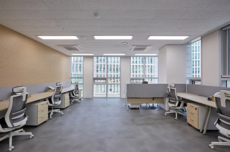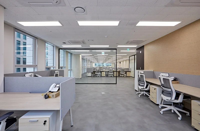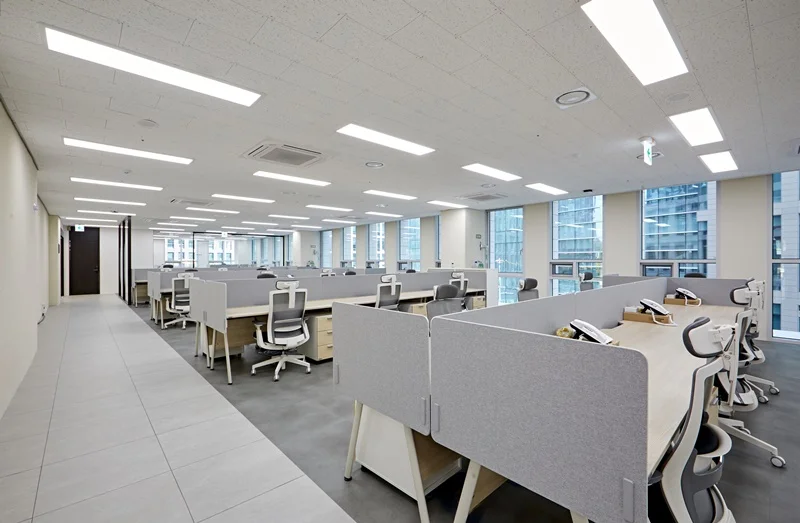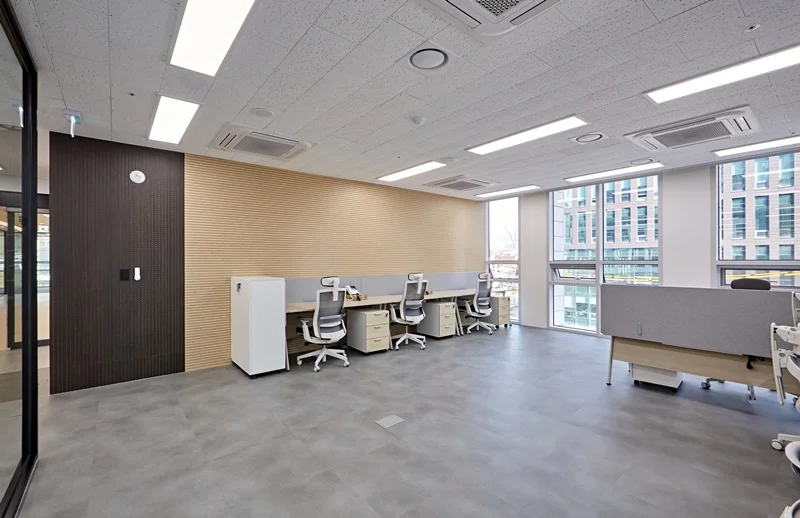 최근 IT 오피스의 트렌드인 노출 천장은 시각적으로 넓어 보이는 효과가 있지만, 흡음 문제가 발생할 수 있습니다. 이를 해결하기 위해 천장에 흡음 패널을 설치하거나 친환경 페인트를 활용한 특수 도장을 진행합니다. 바닥재 역시 장시간 근무에도 발의 피로를 덜어주는 고밀도 카페트 타일이나 내구성이 강한 LVT 소재를 사용하여 기능성과 심미성을 동시에 잡습니다.