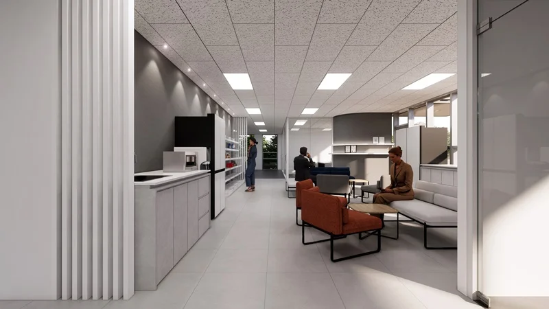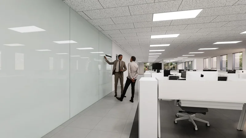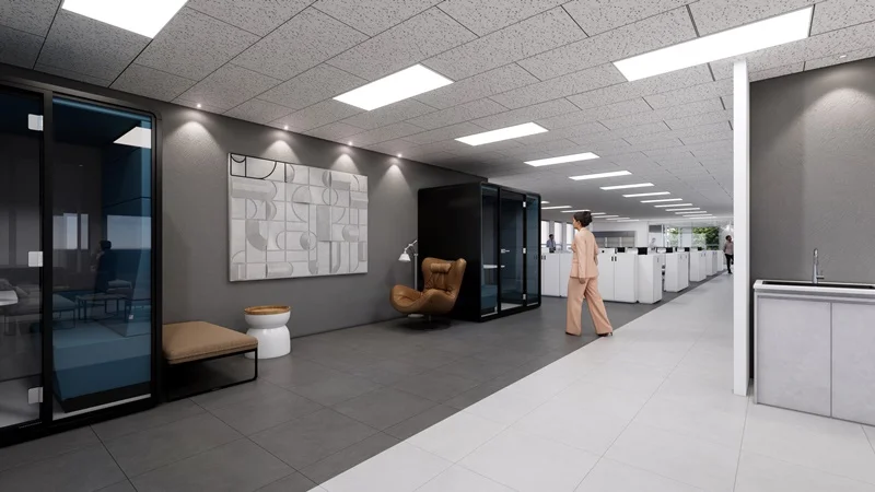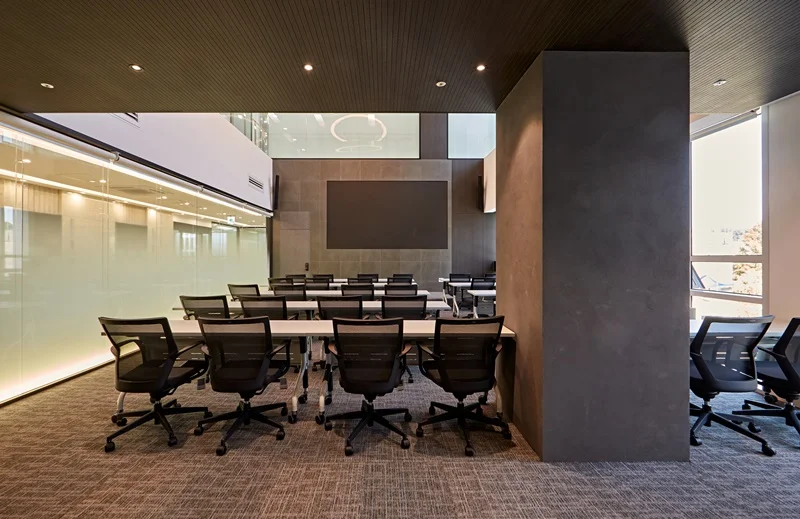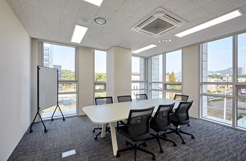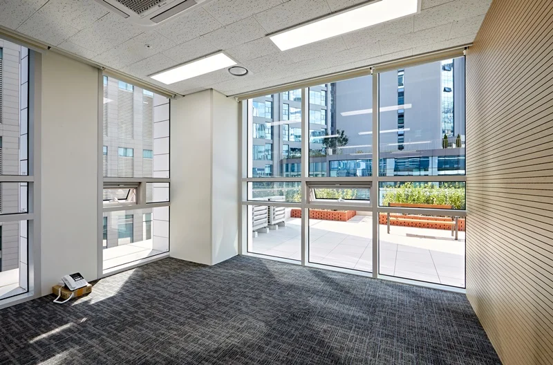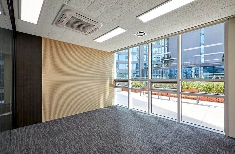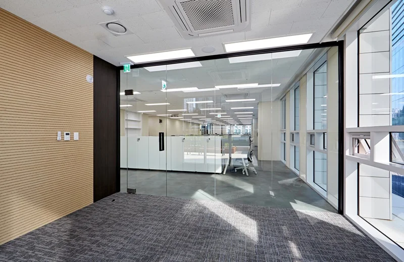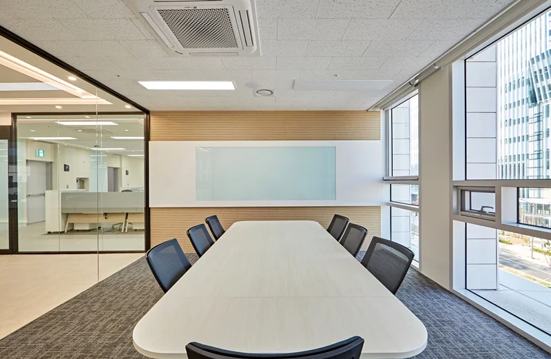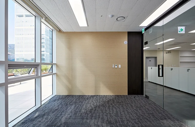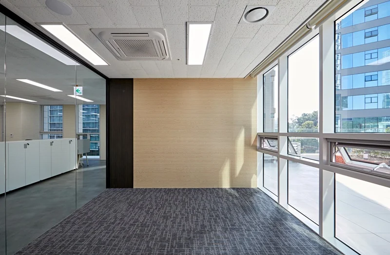 최근 IT 오피스의 트렌드인 노출 천장은 시각적으로 넓어 보이는 효과가 있지만, 흡음 문제가 발생할 수 있습니다. 이를 해결하기 위해 천장에 흡음 패널을 설치하거나 친환경 페인트를 활용한 특수 도장을 진행합니다. 바닥재 역시 장시간 근무에도 발의 피로를 덜어주는 고밀도 카페트 타일이나 내구성이 강한 LVT 소재를 사용하여 기능성과 심미성을 동시에 잡습니다.