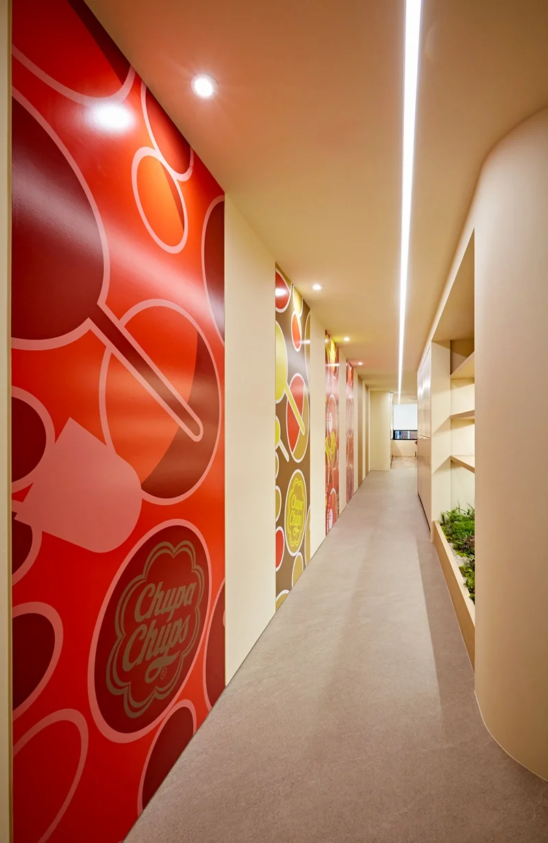 복도로 들어서면 본격적으로 저희 업체만의 컬러 브랜딩 가이드가 펼쳐집니다. 좁고 긴 복도 벽면에는 브랜드의 대표 제품인 ‘츄파춥스’의 팝아트적인 그래픽 시트를 부착했는데요. 레드와 옐로우, 브라운 등 다채로운 원색이 화이트 톤의 벽면과 대비를 이루며 시각적인 즐거움을 선사한답니다. 이때 자칫 산만해질 수 있는 벽면에 매끄러운 곡선 처리를 더해 공간의 흐름을 부드럽게 유도했죠. 복도 천장을 따라 길게 뻗은 일직선의 라인 조명은 공간을 훨씬 길어 보이게 할 뿐만 아니라, 매립형 다운라이트와 조화를 이루어 전시장 같은 고급스러운 조도를 유지해 준답니다.