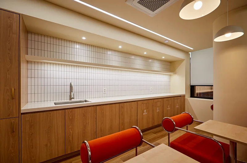 복도 라인을 따라 설치된 직선의 라인 조명은 공간을 훨씬 길고 넓어 보이게 하는 효과를 주는데요. 벽면의 부드러운 곡선 마감과 어우러져 현대적이면서도 편안한 무드를 조성하죠. 복도 중간중간 배치된 낮은 수납장 위에도 미니멀한 조경을 배치하여 업무 공간 사이의 심리적 여유를 부여했답니다. 특히 탕비 공간인 팬트리 영역은 강렬한 레드 컬러의 소파 좌석과 깔끔한 화이트 타일, 그리고 우드 하부장이 완벽한 조화를 이루고 있는데요. 상부 오픈 선반 아래 설치된 간접 조명이 세련된 분위기를 연출하며 직원들이 편안하게 휴식할 수 있는 카페 같은 공간으로 재탄생했죠.
