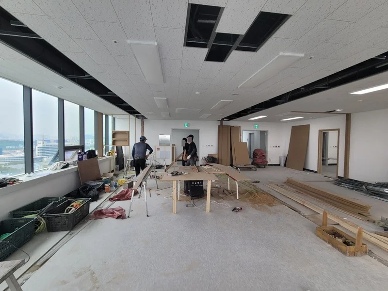 특히 이번 오피스는 수많은 전기 기기와 네트워크 장비가 사용되는 IT 기반의 환경이었기에, 바닥과 벽면 내부의 배선 공사를 평소보다 2배 이상 꼼꼼하게 진행했습니다. 각 책상 위치마다 별도의 콘센트와 데이터 포트를 배치하여 전선이 밖으로 노출되지 않는 깔끔한 업무 환경의 기반을 마련했습니다.