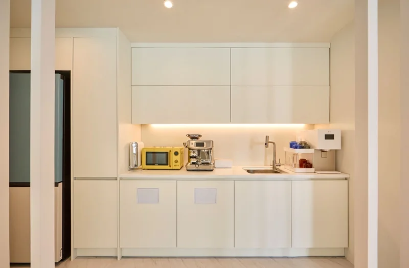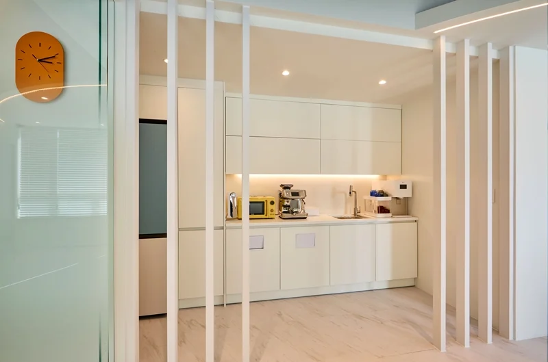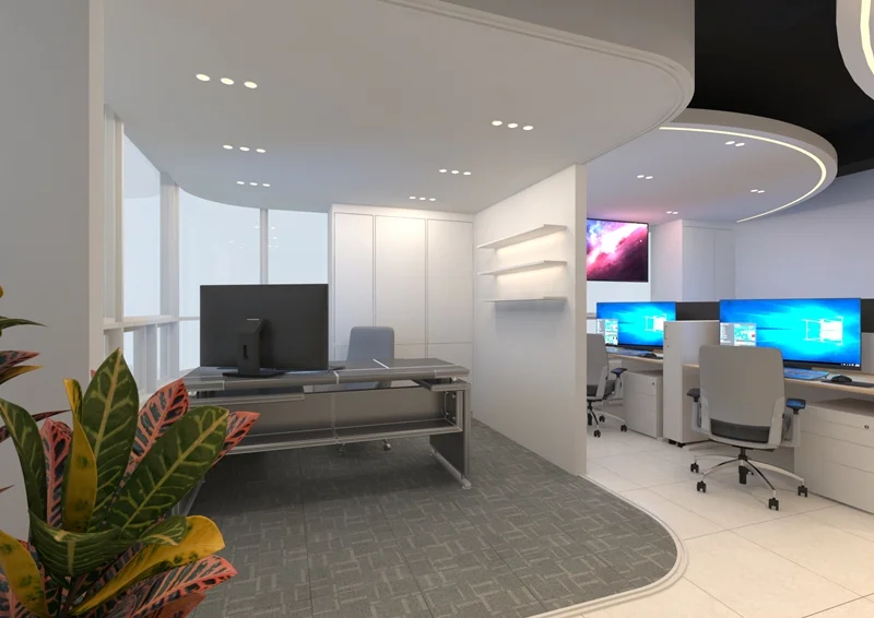 업무 공간: 직원들이 효율적으로 일할 수 있는 공간이어야 하므로 넉넉한 수납공간과 함께 책상, 의자, 컴퓨터 등 필요한 가구를 적절하게 배치해야 합니다.
