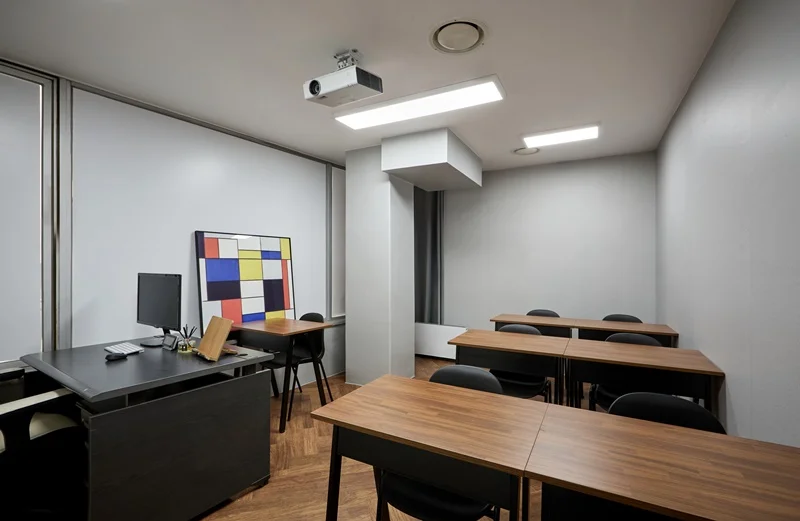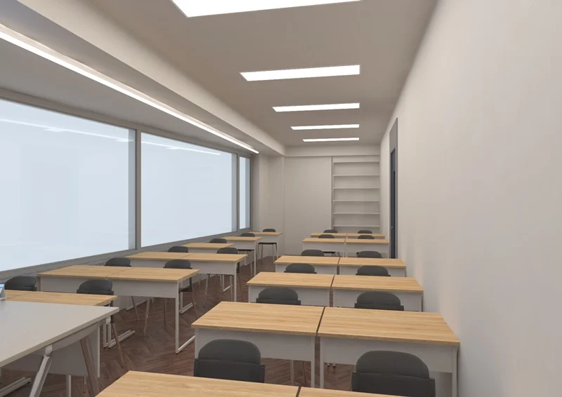 학생들이 장시간 머무는 강의실은 화려함보다 집중력이 중요합니다. 벽면은 오염에 강한 방오 벽지나 페인트를 선택하고, 조명은 시력 보호를 위한 플리커 프리(Flicker-free) LED 평판등을 배치하십시오. 바닥재 또한 의자 끄는 소음이 적고 스크래치에 강한 자재를 선택하여 유지보수 비용을 장기적으로 줄여야 합니다.