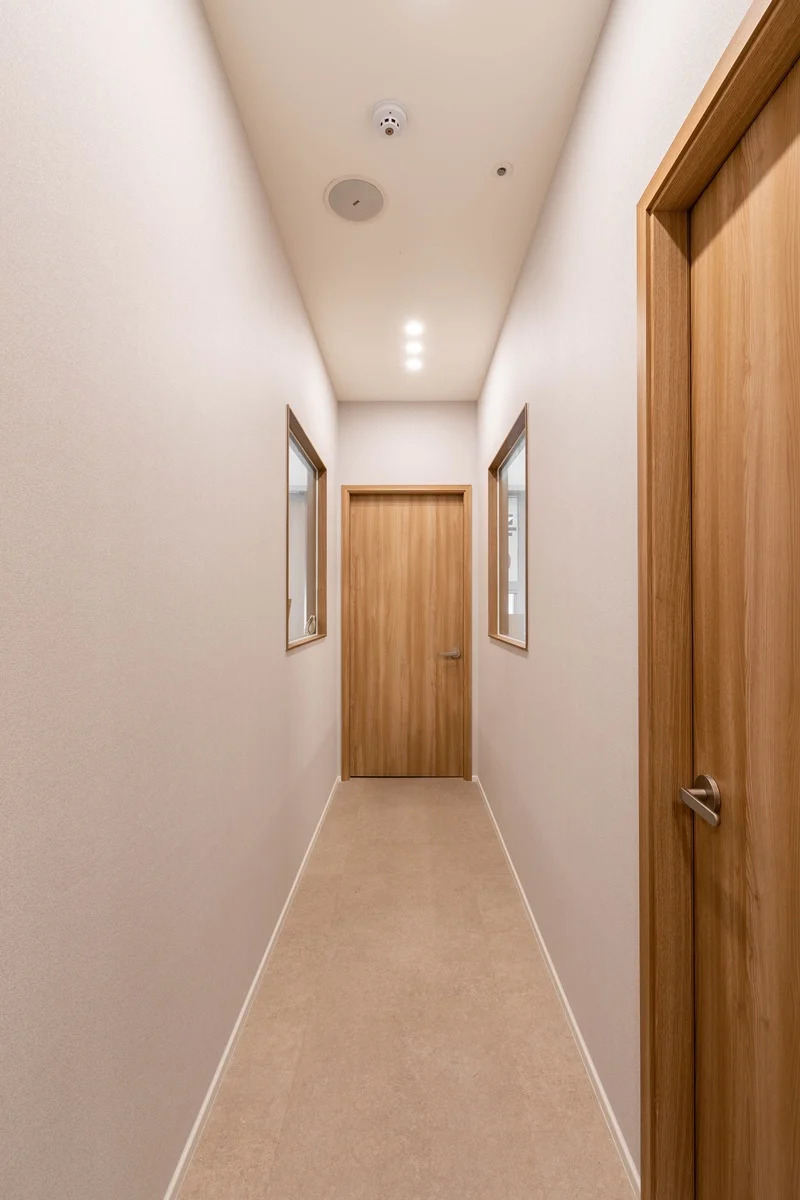 입구를 지나 인포메이션 구역으로 들어서면, 바로 앞쪽으로 복도가 이어지고 그 양쪽으로 강의실이 배치되어 있습니다. 복도는 좁은 폭임에도 불구하고 화이트와 우드 톤의 조합으로 아늑한 느낌을 주었으며, 벽면 일부에는 브랜드 로고와 사인물을 부착해 학원의 아이덴티티를 강조했습니다.