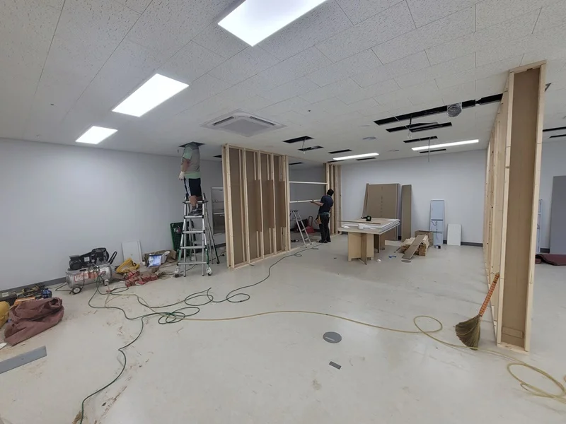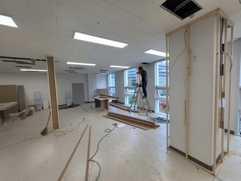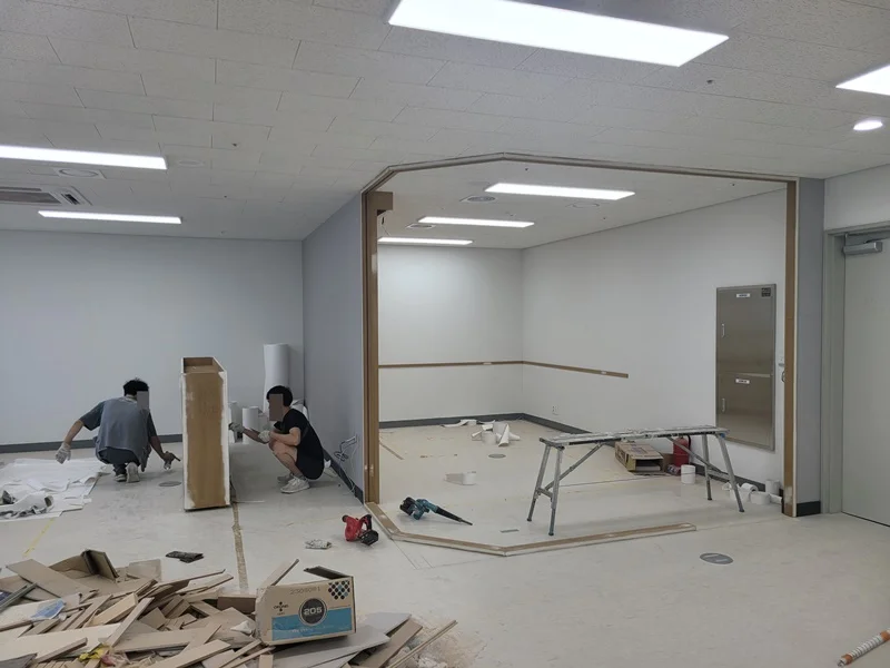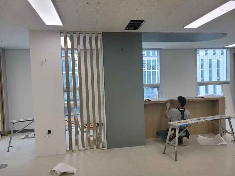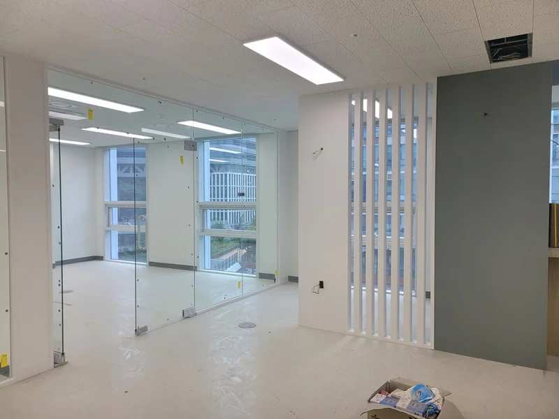 설계도가 완벽하다면 그 다음은 숙련된 기술자들의 정교한 손길이 이어질 차례이죠. 20평사무실인테리어 공사 현장은 여러 공정이 좁은 공간에서 동시에 이루어지기 때문에 공정 간의 간섭을 최소화하는 체계적인 현장 관리가 필수적이랍니다. 가장 먼저 진행된 가벽 공사에서는 시야를 가리지 않으면서도 공간을 효율적으로 분리하기 위해 금속 프레임을 최소화한 상하부 매립형 레일 작업을 진행했는데요. 이는 나중에 설치될 통유리 가벽의 깔끔한 마감을 결정짓는 핵심적인 공정이었죠.