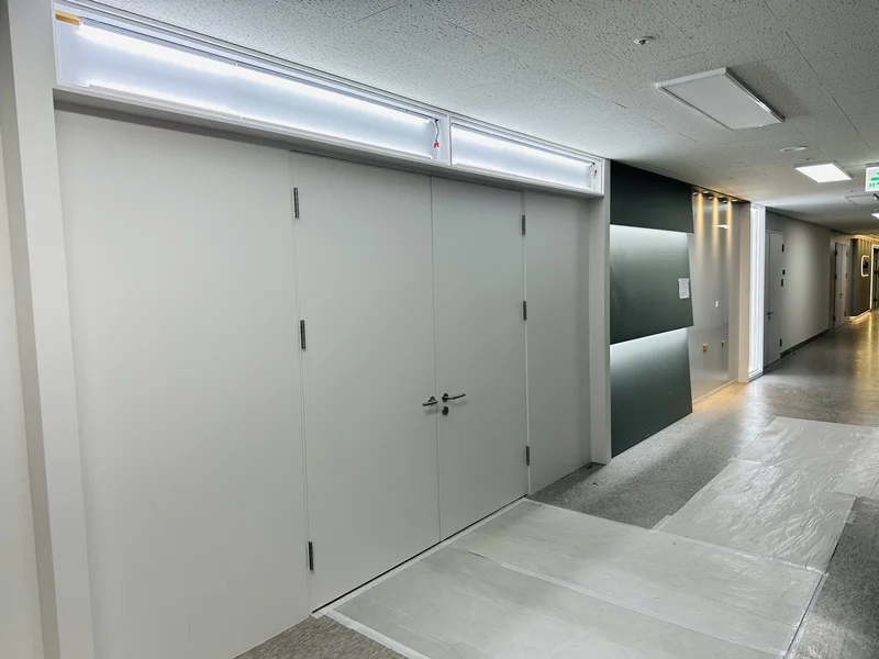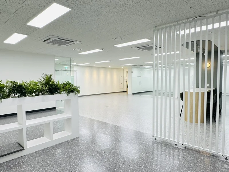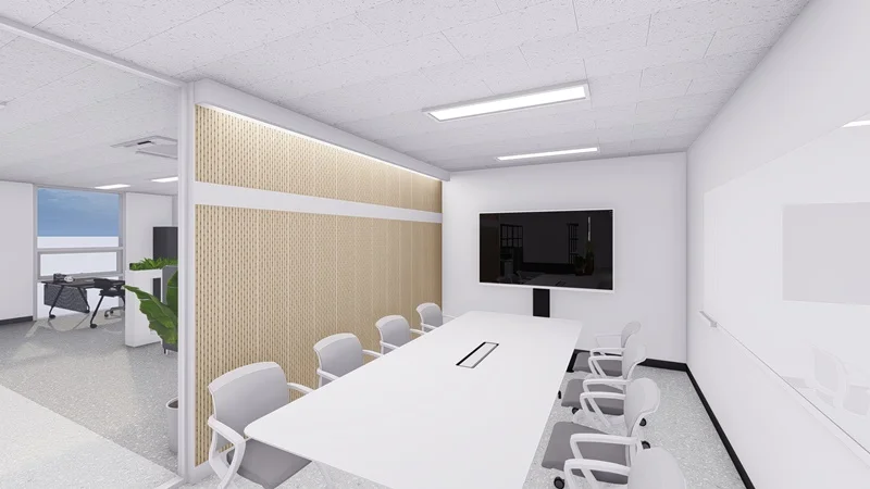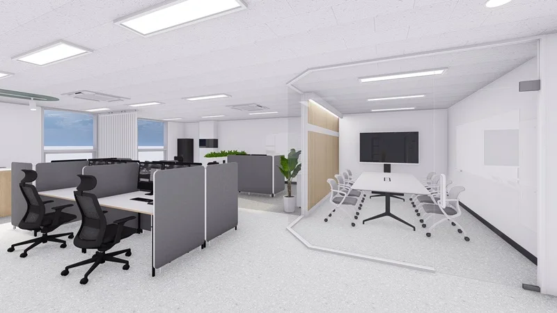 회의실 내부는 화이트보드로 활용 가능한 벽면과 효율적인 매립 조명을 설치해 기능성을 높였으며, 넓은 창을 통해 들어오는 채광은 블라인드로 섬세하게 조절할 수 있도록 설계했습니다. 천장의 시스템 에어컨 역시 화이트 톤으로 통일해 천장 라인이 깔끔하게 정리되었고, 복도와 연결된 코너 부분의 라운드 마감은 이동 중의 안전성과 시각적 부드러움을 동시에 충족시킵니다. 마지막으로 곳곳에 배치된 콘센트와 스위치 위치까지 사용자 동선을 고려해 배치함으로써, 심미성과 실용성이 완벽하게 결합된 프리미엄 사무 공간이 완성되었습니다.