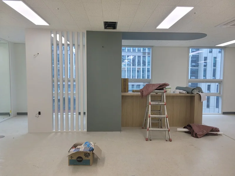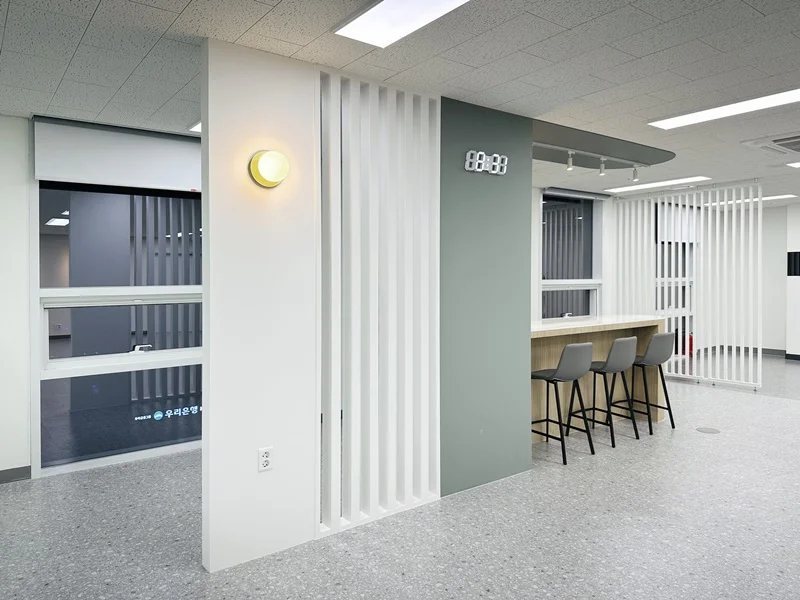 드디어 모든 공정이 마무리된 현장의 모습을 꼼꼼히 살펴볼까요? 우선 복도에서부터 시선을 압도하는 외부 파사드는 화이트와 그레이의 대비를 활용해 절제된 세련미를 강조했습니다. 벽면 전체를 채운 매끄러운 마감재 위에 입체감 있는 로고와 간접 조명을 더해, 들어오기 전부터 신뢰감을 느낄 수 있는 전문적인 분위기를 연출했답니다. 특히 상단의 면조명은 입구를 밝게 비추어 공간이 더욱 확장되어 보이는 효과를 주죠.