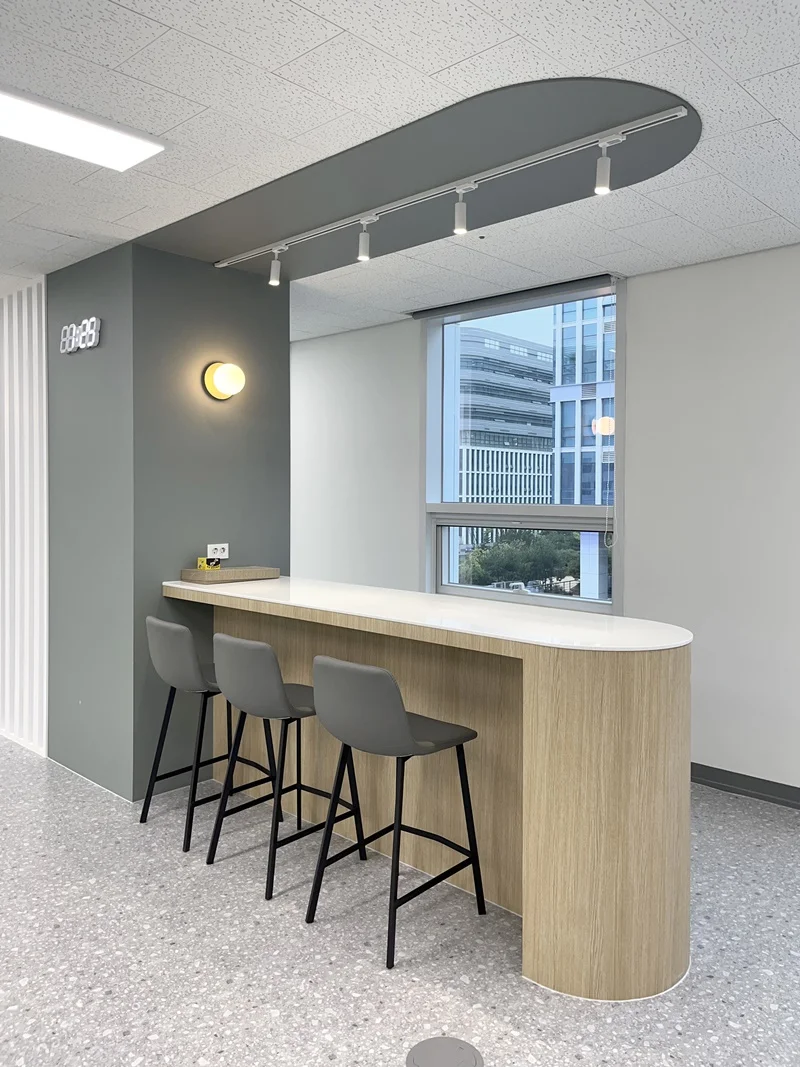 공간의 백미인 곡선 바 테이블 구역은 단순한 탕비실을 넘어 소통의 허브 역할을 합니다. 직선으로 이루어진 공간 속에서 부드럽게 꺾이는 라운드 테이블은 동선을 유연하게 유도할 뿐만 아니라 공간에 리듬감을 부여하는데요. 상판의 화이트 톤과 하부의 밝은 우드 톤이 매치되어 아늑한 카페 같은 분위기를 자아냅니다. 테이블 위 천장에는 곡선형 트랙에 스포트라이트 조명을 배치해 필요에 따라 조도를 조절할 수 있게 했고, 벽면의 그레이 포인트 월에는 입체적인 디지털 벽시계와 둥근 구 형태의 벽 등을 설치해 조형적인 미를 더했습니다.