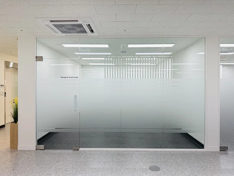 메인 업무 공간과 미팅룸을 나누는 통유리 가벽은 소형 오피스의 한계를 완전히 지워버립니다. 프레임이 거의 보이지 않는 깔끔한 유리 벽체는 시각적으로 막힘이 없어 20평보다 훨씬 넓어 보이는 착시 효과를 주는데요. 여기에 가로 라인의 불투명 시트지를 적절한 높이에 시공하여 업무의 집중도를 높이면서도 개방감을 놓치지 않았습니다. 유리문에 설치된 깔끔한 실버 핸들은 모던한 감각을 더해주며, 도어 하부의 힌지까지 매립형으로 처리해 시각적 노이즈를 최소화했습니다.