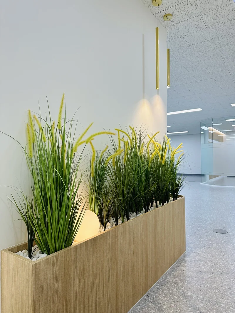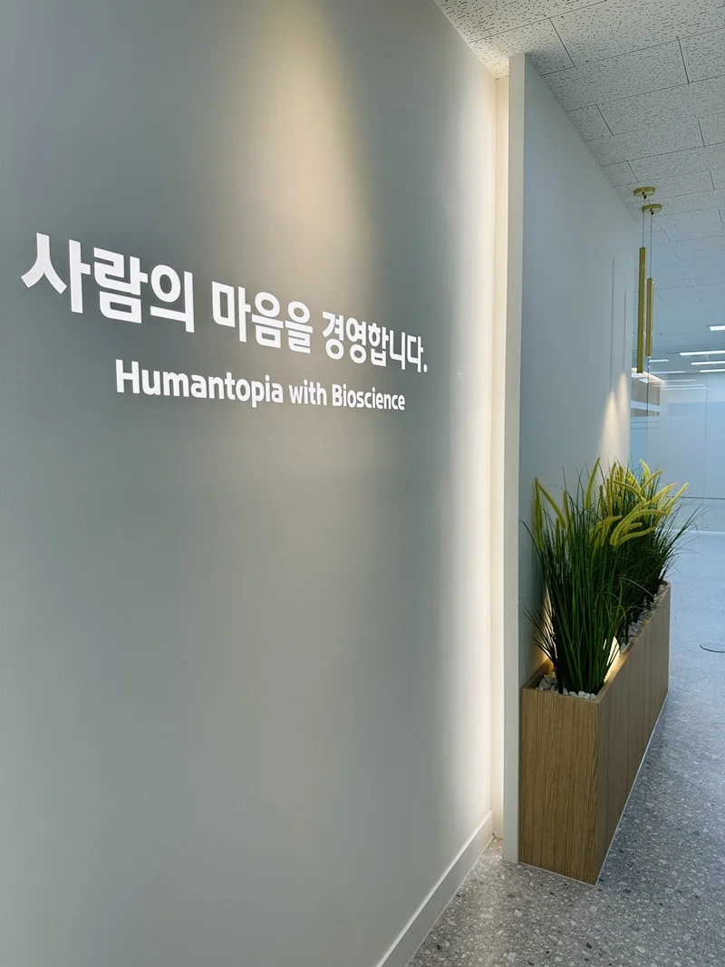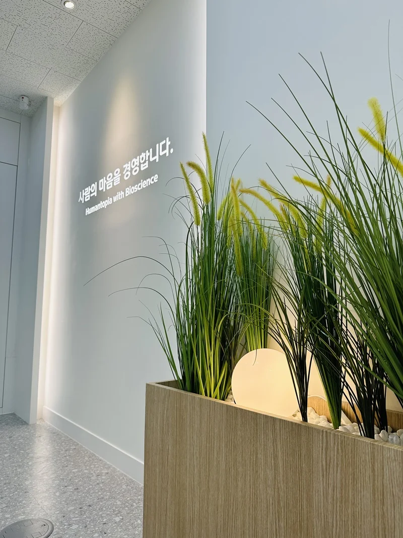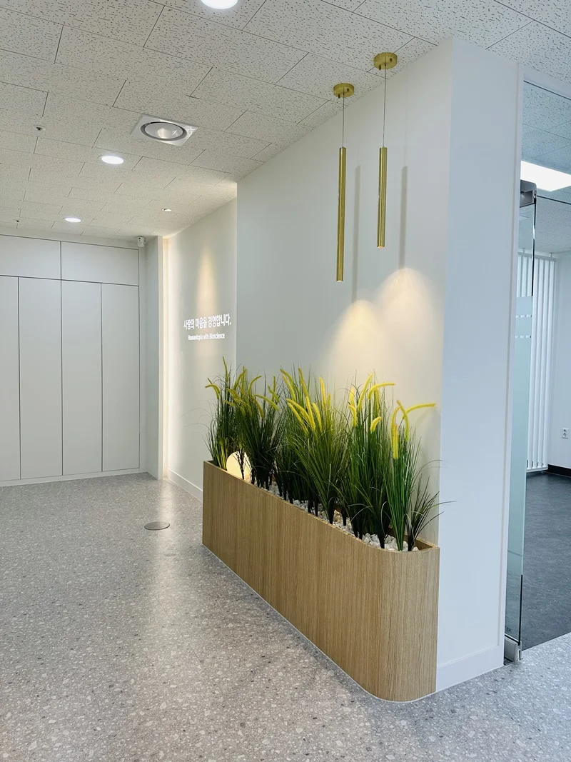내부로 들어서면 가장 먼저 마주하는 이미지 월은 이번 인테리어의 철학을 보여줍니다. 부드러운 화이트 벽면에 따뜻한 웜톤의 조명이 쏟아지고, 그 아래로는 풍성한 조화와 우드 톤의 플랜트 박스가 조화롭게 배치되어 있는데요. 이는 자칫 차갑게 느껴질 수 있는 사무 공간에 자연의 생명력을 불어넣는 ‘플랜테리어’의 정석이라 할 수 있습니다. 옆면의 유리 가벽 너머로 보이는 공간들과 어우러져 첫인상부터 탁 트인 개방감을 선사합니다.